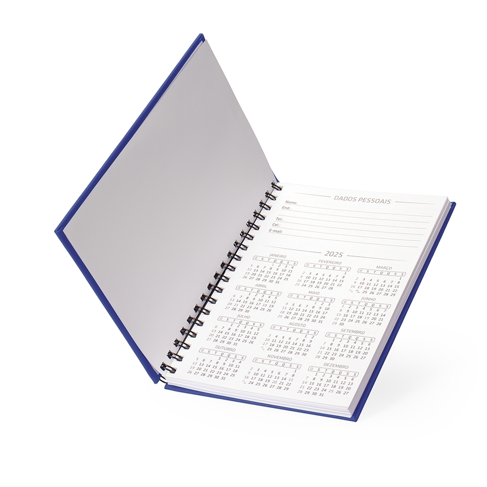 Caderno emborrachado de frente e verso lisa com espiral preto. Possui dados pessoais, calendário de 2025 à 2027, aproximadamente 100 folhas brancas pautadas com detalhe “data” na parte superior de cada folha.