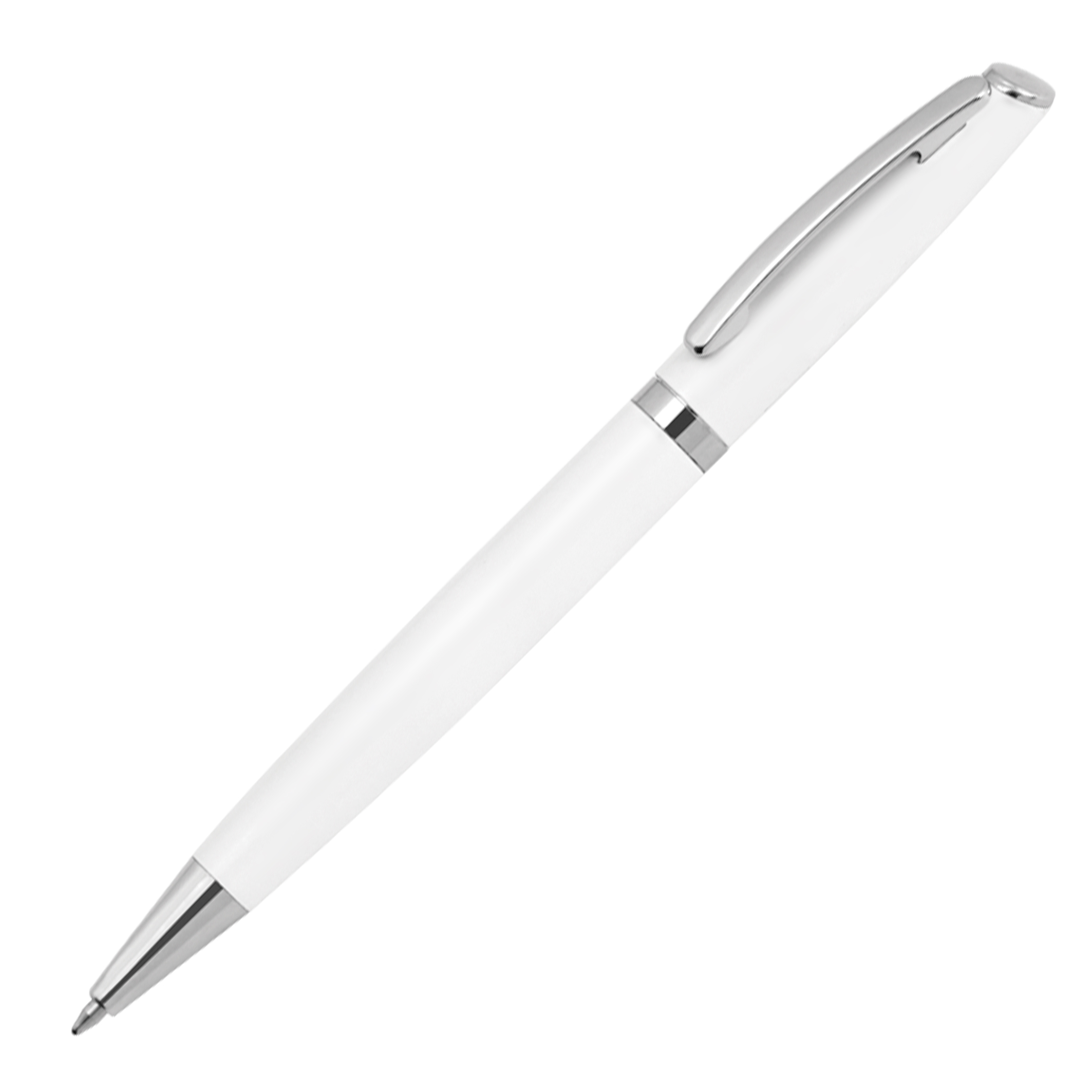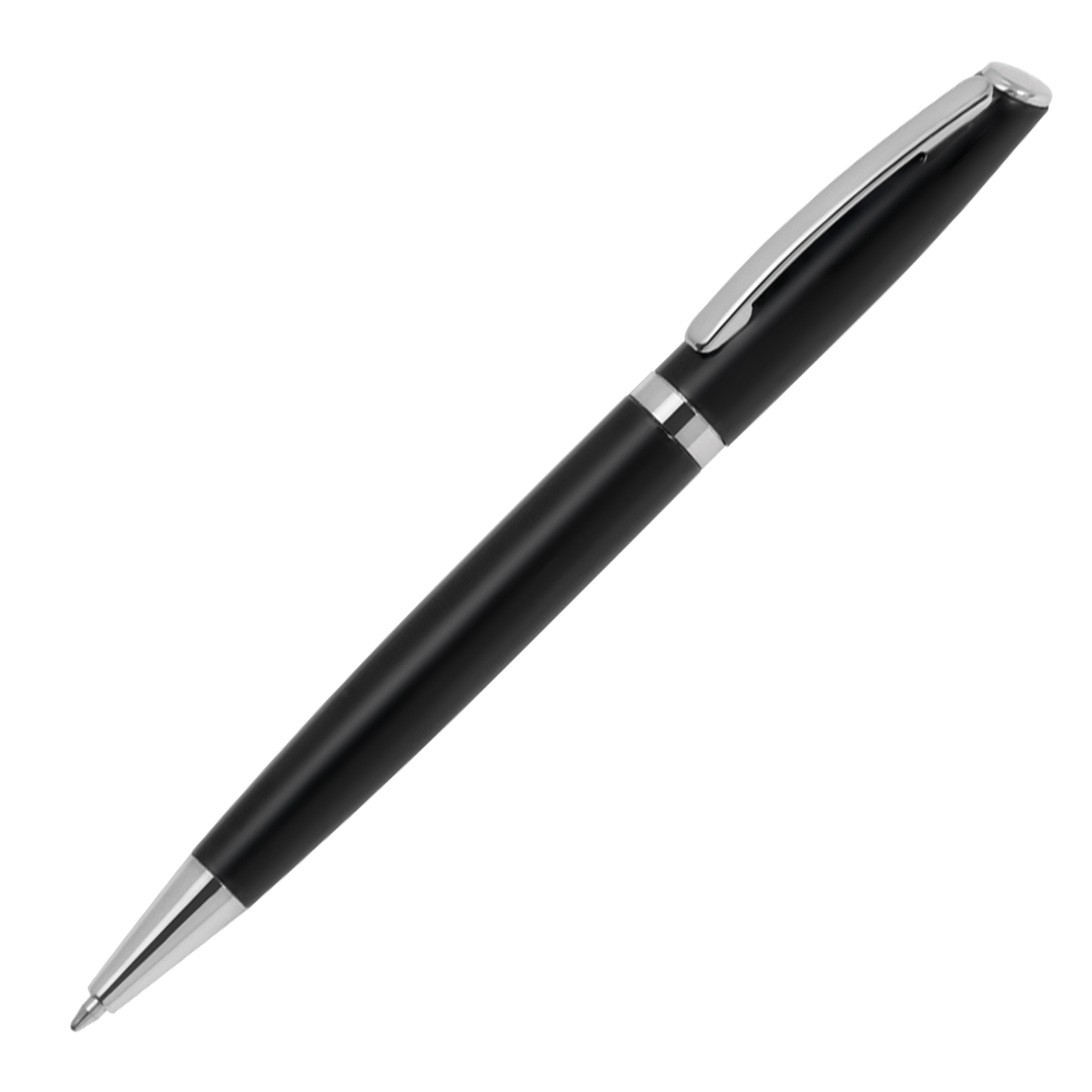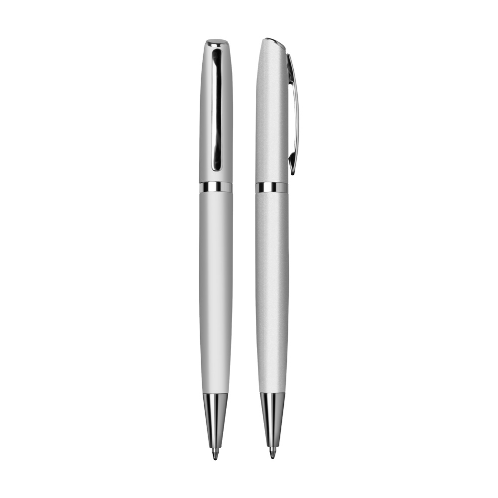 Caneta esferográfica de alumínio fosca escrita em azul.