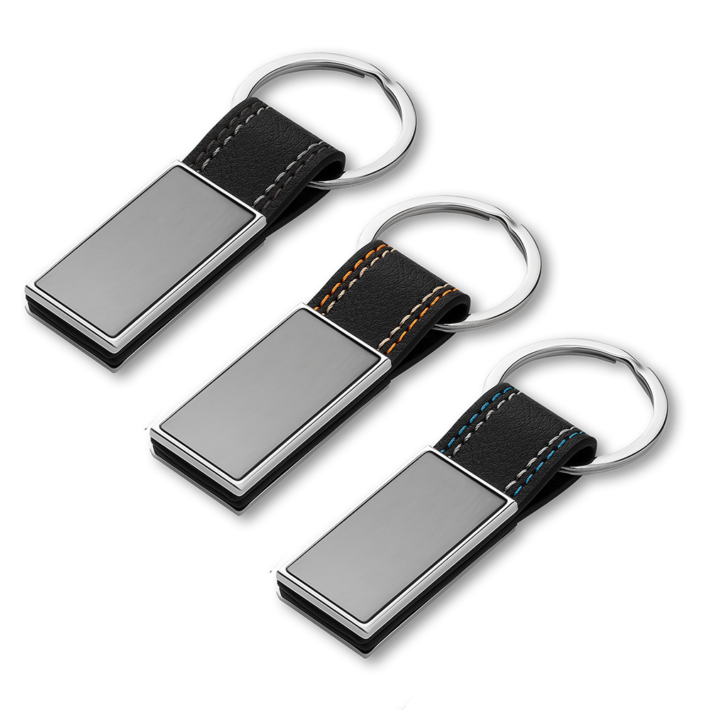 Chaveiro de metal em níquel brilhante + PU, acompanha caixa com berço aveludado.