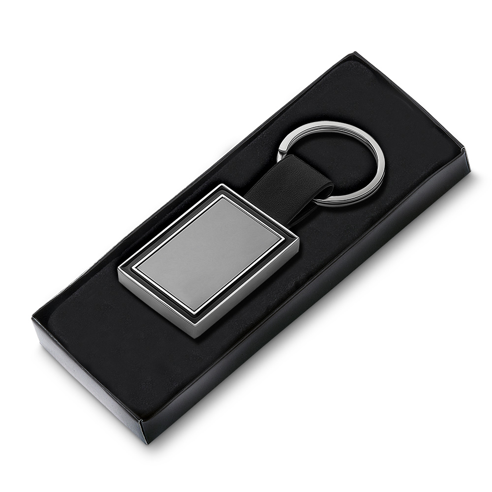 Chaveiro de metal em níquel brilhante + PU, acompanha caixa com berço aveludado.