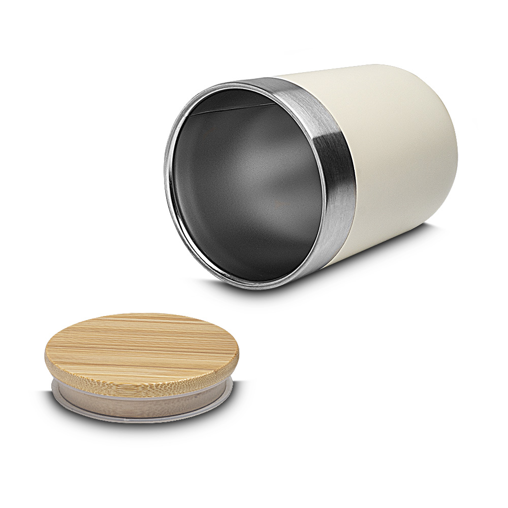 Copo térmico em aço inox, pintura fosca, detalhe em aço inox, tampa em bambú com anel de silicone para vedação, capacidade de 300ml.