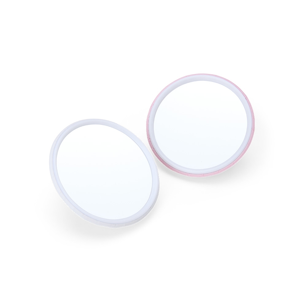 Espelho plástico sem aumento, verso com película de ferro com acabamento fosco e detalhes de brilho tipo glitter.