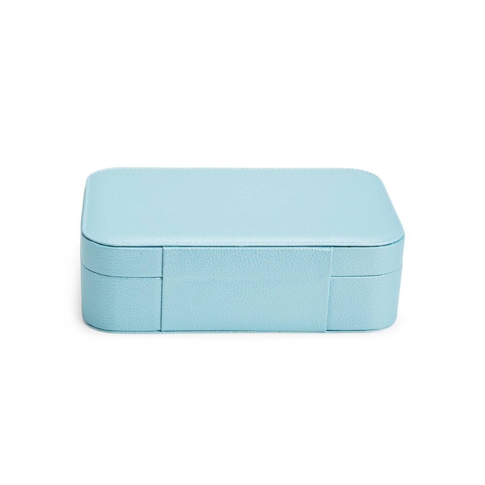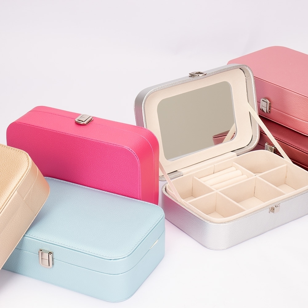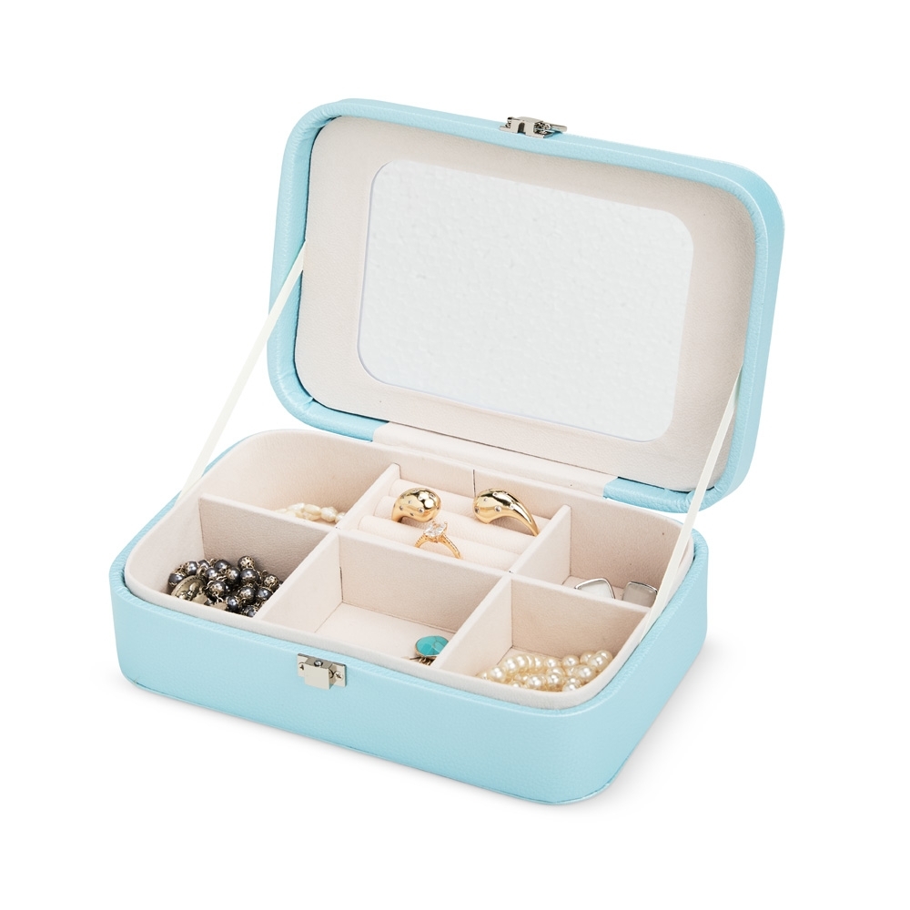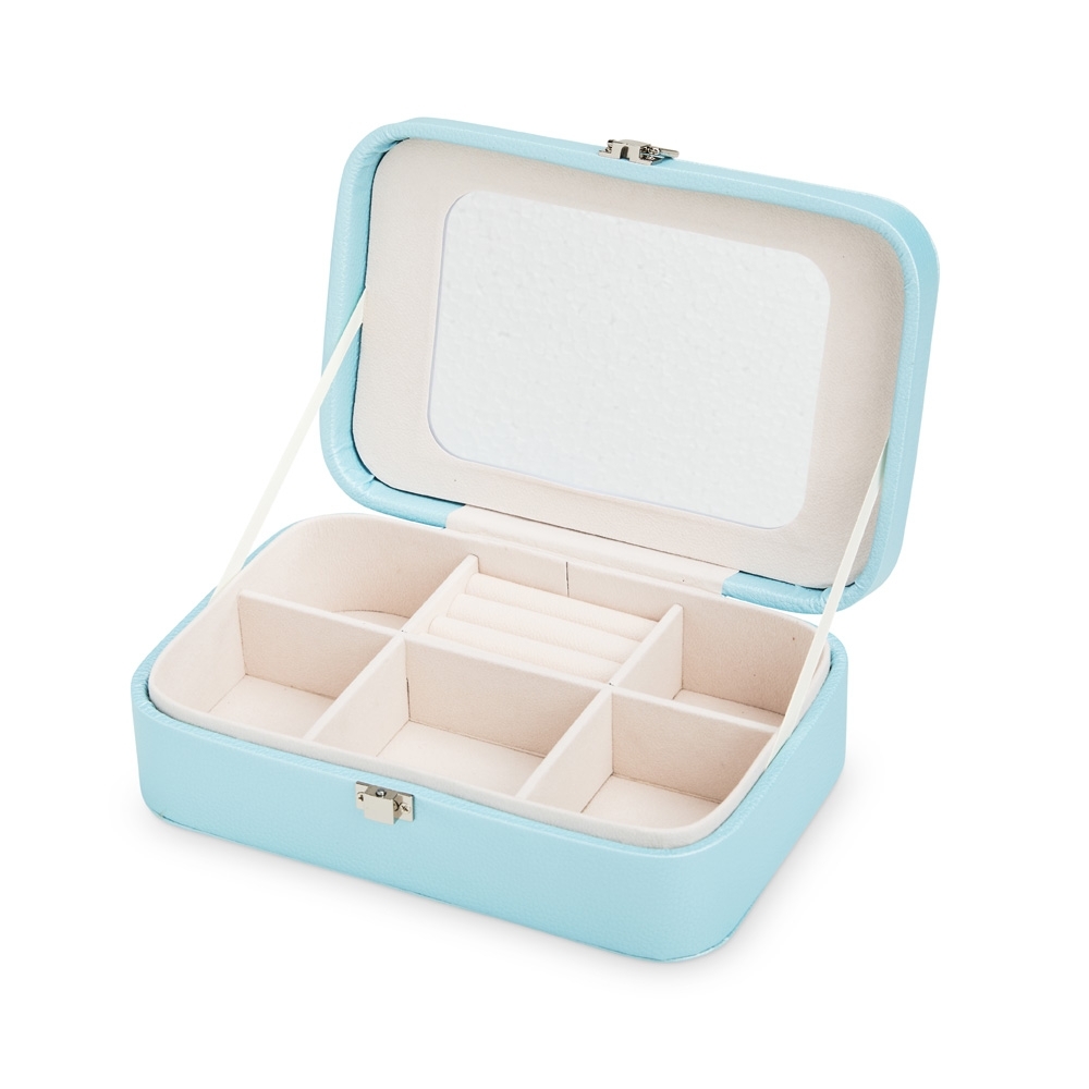 Porta-joias em poliuretano (PU) e revestimento interno aveludado. Apresenta, em seu interior, um espelho fixo e mais seis divisórias, incluindo uma repartição almofadada com ranhuras para guardar anéis. Além disso, o estojo possui trava de segurança para fechamento.
